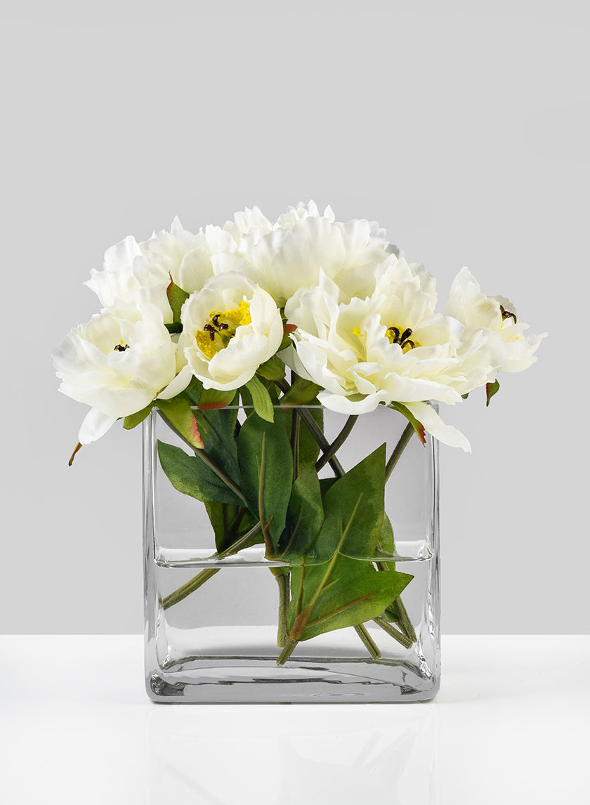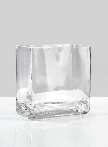 This handblown glass vase adds a cool, sleek presence to any arrangement with sharp angles and gentle curves. While the broad, glass walls provide weight and support, their simple shape enables decorative infill or plants to show.