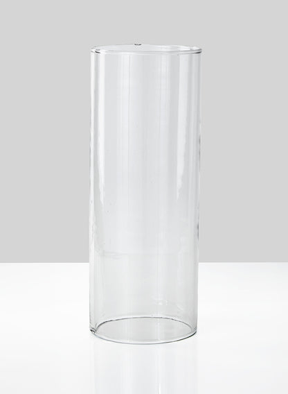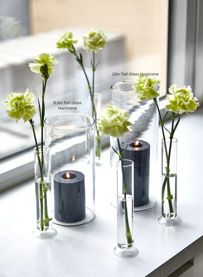 Protect your pillar candles from draft and enhance the look of your tablescape with this simple glass hurricane candleholder. The glass cylinder is open on both ends to easily slip over a pillar candle and it will fit up to a 4-inch diameter candle. The glass has a slightly aged tint and finish to it. Pair it with the smaller size hurricane on your tables or in a window, like we did here, with chic black pillar candles, surrounded by pale green carnations in clear glass bud vases.