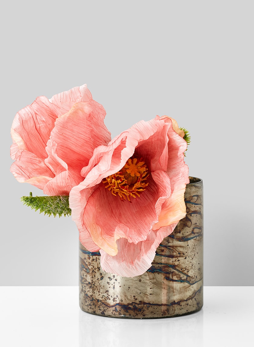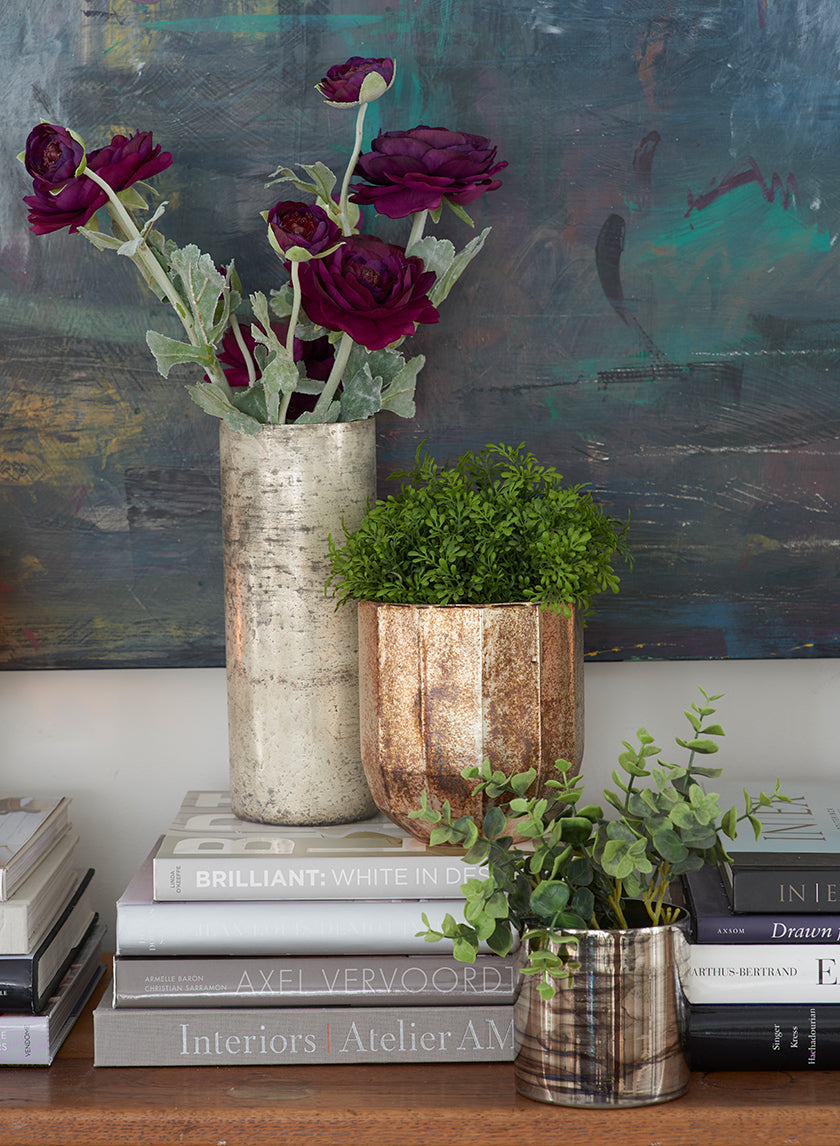 Mix and match your oxidized  champagne mercury glass vase with its matching smaller vases to add some drama to your cocktail hour tables or event centerpieces. You can complement the vase's distinct coloring by pairing it with coordinating tea light holders or even a stately black pillar candle on an Oil Slick Iron Tray.