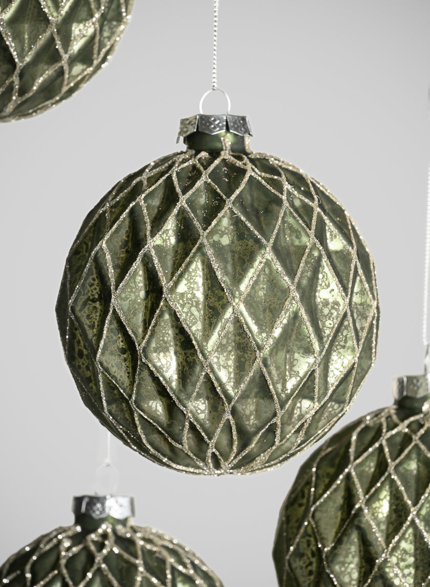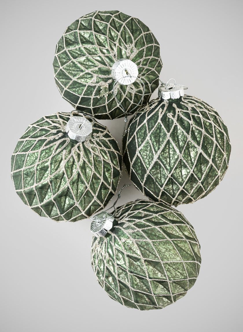 4in Round Gilded Antique Silver Forest Pine Green Glass Ornament, Set of 4