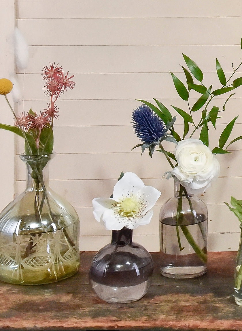 When paired with glass ball bud vases in other materials and shapes, these smoky vases can help create a fun, eclectic, and vintage look—group a handful of mismatched vases on a table, bar, or mantelpiece to great effect.