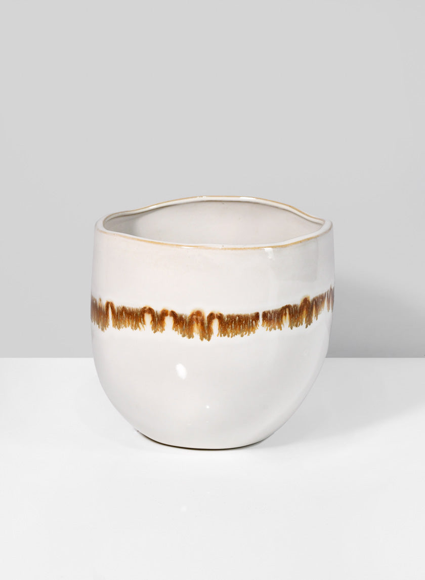 Keep your wedding decor coordinated with vessels and bowls that are the same from your cocktail hour to the wedding reception, and at the after party. The mocha stripe ceramic container suite comes in three different sizes: this vase, the smaller apple ceramic bowls, and prince ceramic bowls.
