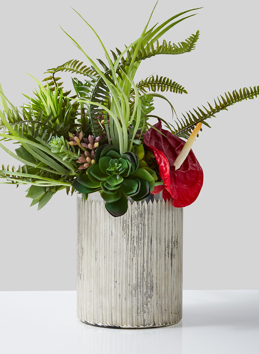 We made this wild and lovely arrangement with a faux succulent bouquet and a faux anthurium. However, you can fill these silver etched mercury glass vases for sale with any type of succulent, flowers, or greens that match your event’s theme and location. You will need to use a liner if you plan to put any liquids or fresh flower arrangements in these cylinders.