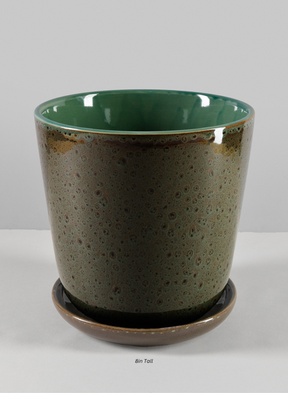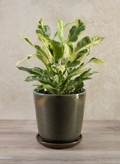 • A green glass vase holds three pale green hydrangea blooms with large green leaves, set on a wooden surface against a neutral beige background.