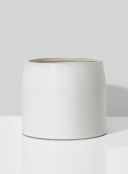This contemporary, wide-mouthed white flower pot is the perfect piece for modernists. The slightly off-white color is finished with a low-gloss glaze, offering a more muted tone for flowers to shine around. The mouth has a light brown ring, which will blend with soil or provide a backdrop for overhanging leaves and succulents. The cylindrical vase tapers slightly towards the top, a common design element in many ceramic flower pots.