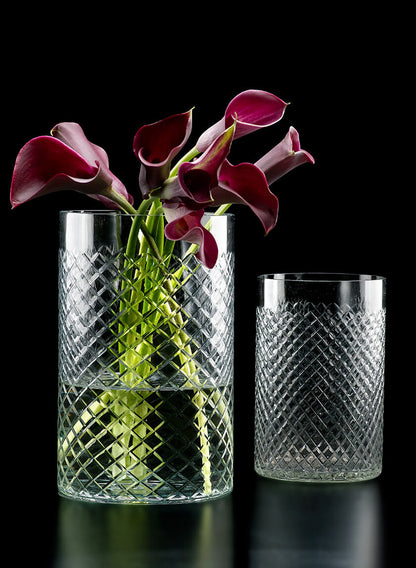 Whether your floral arrangements feature a traditional assortment of blooms or you love the contemporary appeal of monochromatic bouquets, your flowers will look great displayed in our etched glass cylinders. Even a few signature stems, like a loose arrangement of brown calla lilies, look elevated within our high cut glass square cylinders. You can also pair your glass cylinders with some chic pillar candles to add a warm glow to your centerpiece.
