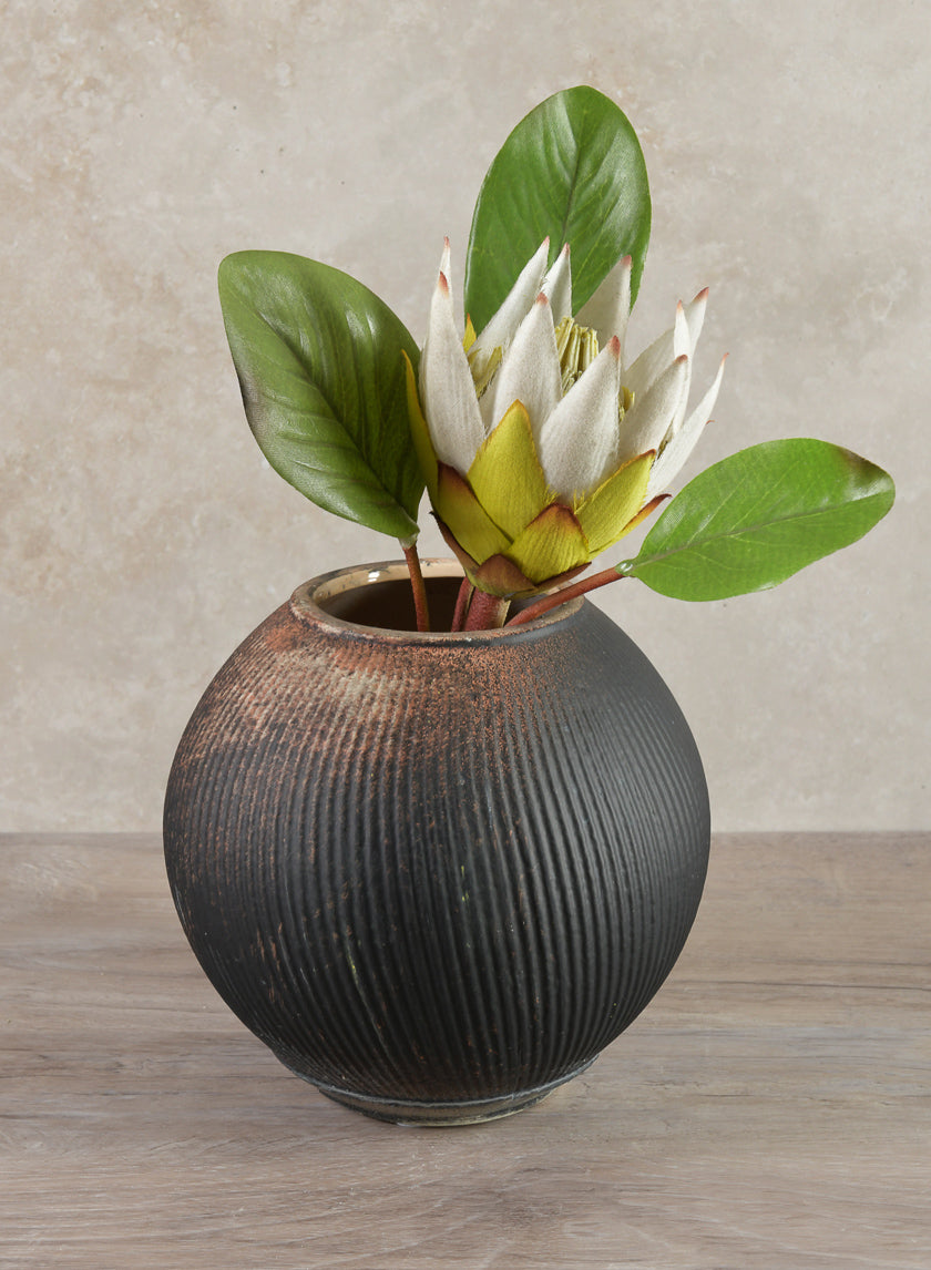 Artistry at its finest is on display in the Bashira Ethnic Aged Clay Fishbowl. It combines cultural allure, rich earth tones, and textural depth. This magnificent item would enhance any modern, bohemian, or globally inspired event with its genuine rustic charm.
