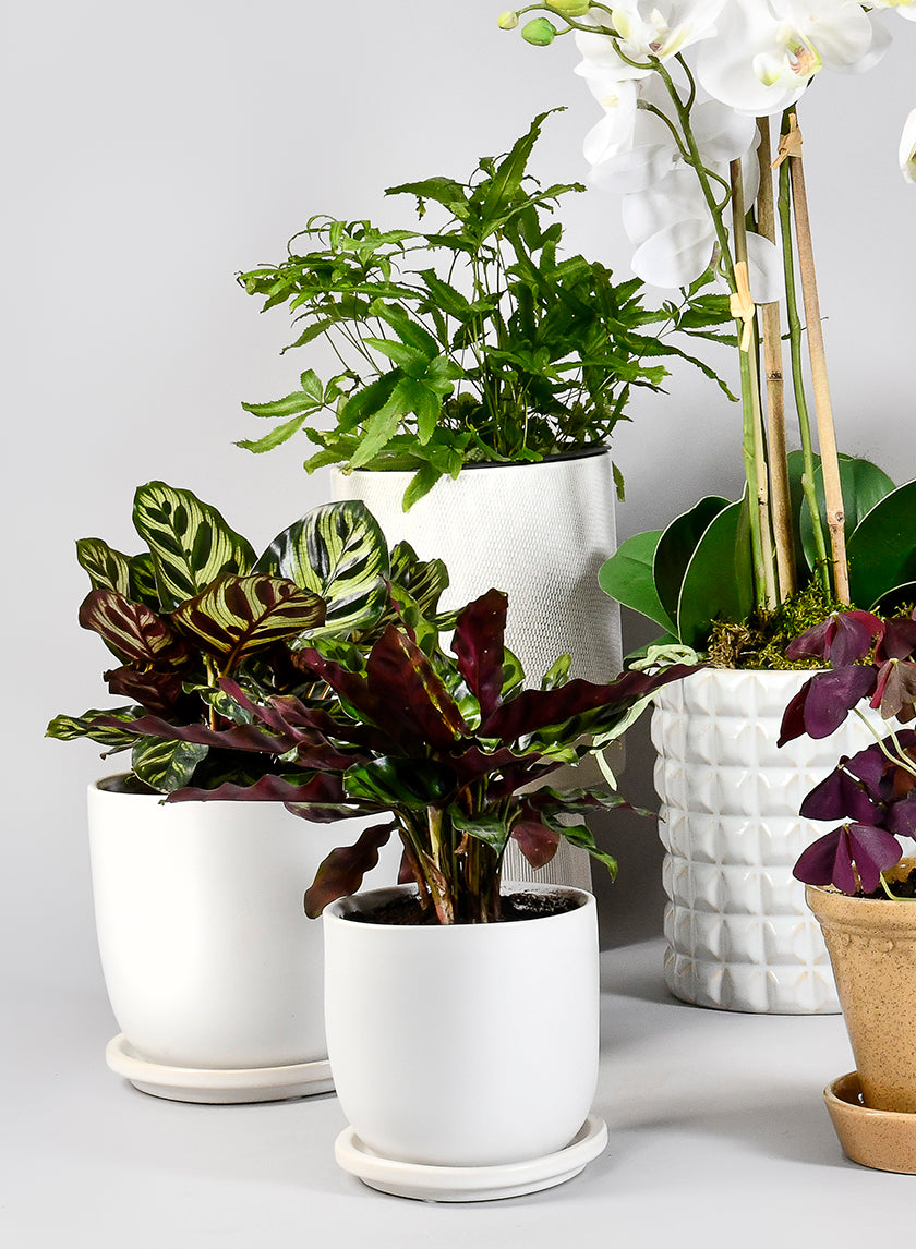Add a fresh, green element to an indoor space by arranging realistic-looking succulent picks such as our pachyphytum pick or dudleya pick in and around the flower pot. Or, create brilliant outdoor centerpieces without the stress of watering or wilting by pairing ceramic pots with a white rose and succulent bouquet. If you have a potted plant such as a Zanzibar gem plant that doesn't match your event theme, this ceramic pot is a perfect option for a new base.