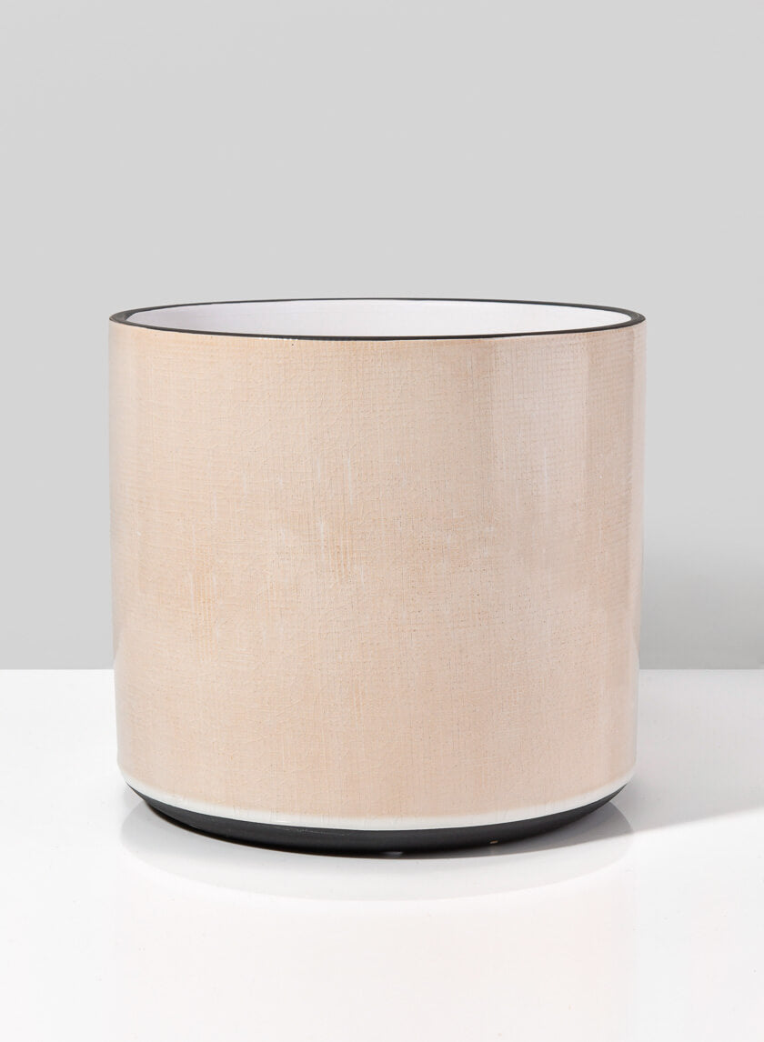 Note all the beautiful details on this round ceramic vase: a pattern of fine lines that give it the look of woven linen fabric in a pretty rose beige color finished with a clear glaze, an unglazed black top rim and a unglazed black band at the bottom. At just over 7 inches this can be the base for a larger mixed flower arrangement, a dome bouquet of peach roses for a monochromatic but modern look, or use it as a cachepot for a potted plant. We used it to hold a small fern.