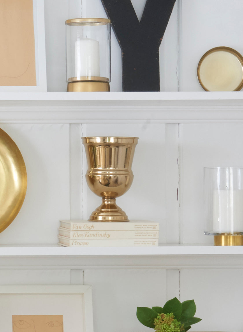 Our 7-inch decorative gold iron urn vase is the perfect container for big blossoms and blooms. Its cylindrical and smooth body shape combined with the shiny gold finish renders it the perfect complement to any floral display.