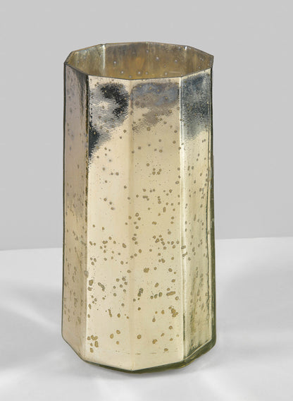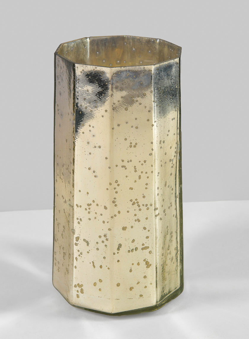 The vase's elegant silhouette, with its gently rounded body and flared neck, for classic design and modern versatility. Its textured surface enhances the shimmering mercury finish, catching and reflecting light beautifully to create a warm, inviting ambiance