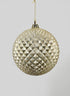 This is the ornament ball to get for big holiday impact. At 8-inches, it is wonderful as an ornament in larger Christmas trees, and the common size hung in holiday windows, adding its pretty metallic champagne color and sparkle from iridescent glitter. The durian pattern of raised, pointy studs all over the ornament, add a rich texture and boost the amount of visible sparkle from the glitter.