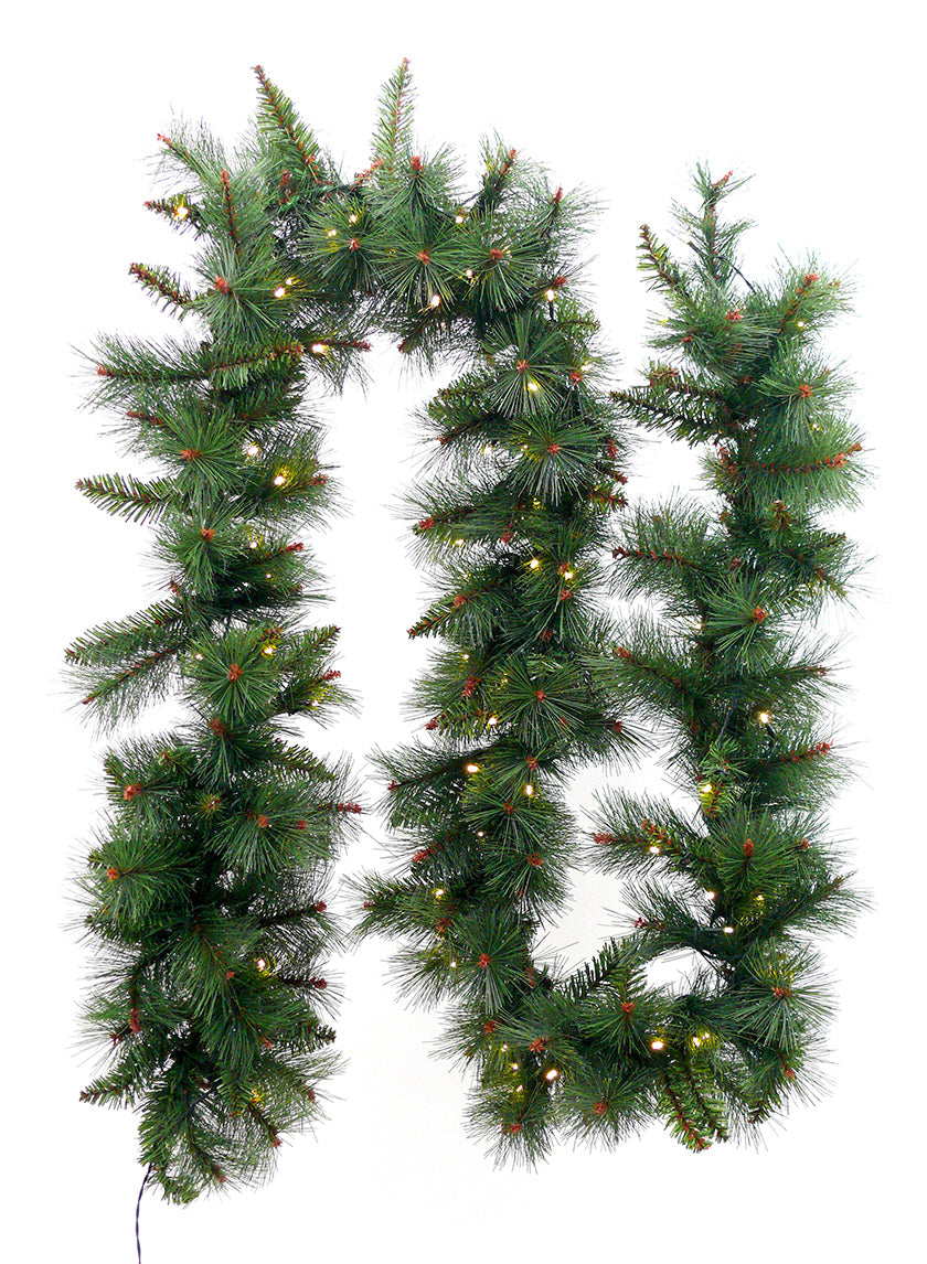 Each garland with warm white lights is 9 feet long and features 100 LED lights. Whether you decide to place your display around a railing, over a door frame, across a mantle, or as a table centerpiece, this garland is a great way to enhance any winter event.