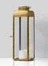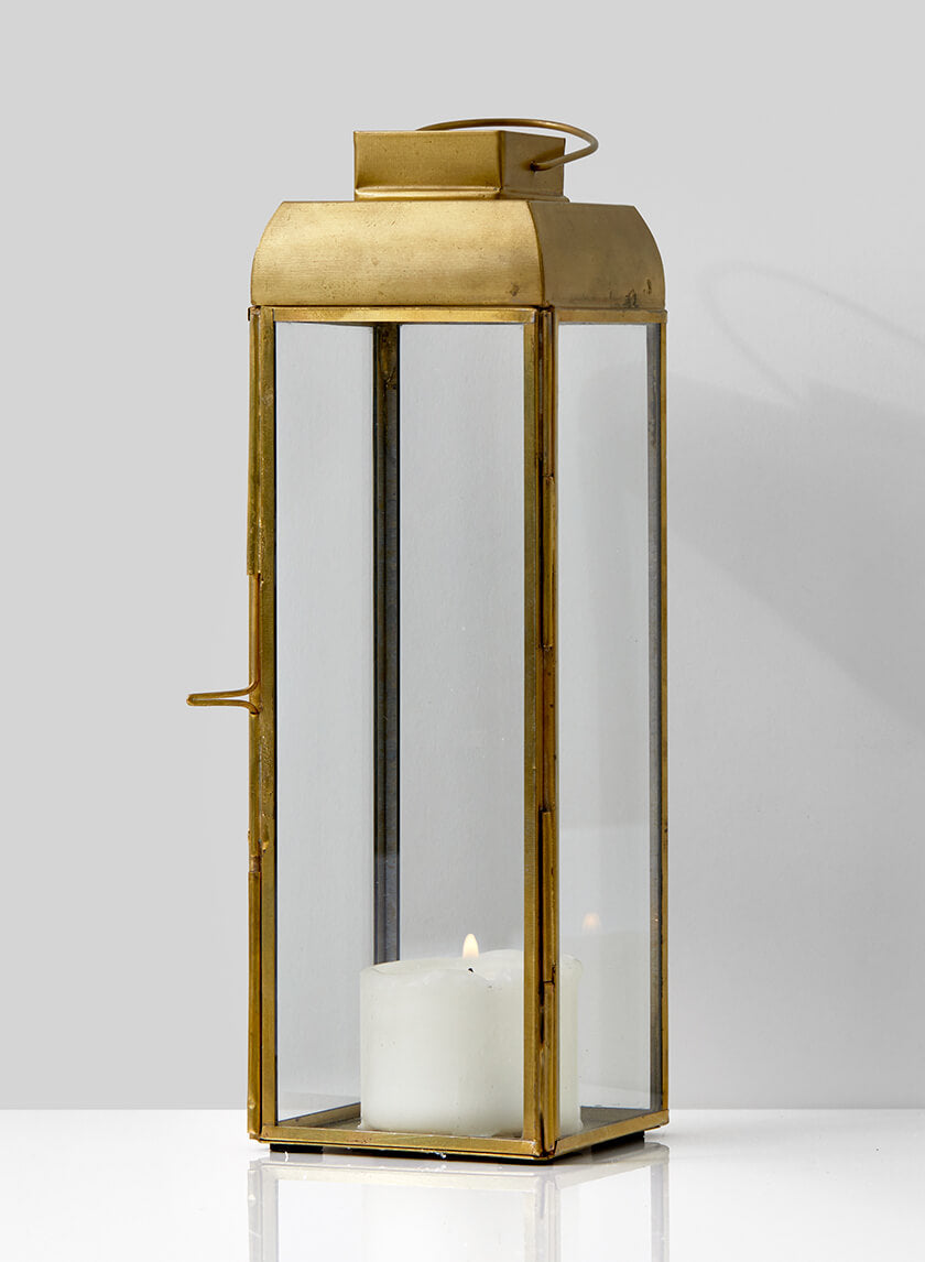 Our Alazhar lanterns all feature a square metal frame with clear glass panels and come in both gold and antique bronze finishes. This lantern has a rich gold color and will fit our prefilled votives or a 2-inch pillar candle as shown in our lantern. Add the smaller gold Alazhar lantern to your tablescapes with floral centerpieces in our Bretagne oblong vase for a more contemporary look, or arrangements in our brass julep cups for a more classic feel.