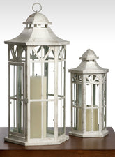 These lanterns are available in two sizes, including a 14-inch tall lantern, and a 20-inch tall lantern. Select the lantern size that best fits your space, or mix and match sizes to create unique, multi-level displays for your home or your next event. Our antique white lanterns are constructed from sturdy tin and finished with gold highlighting to achieve a classic, aged look. Accentuated with long glass panels, our white lanterns will be the elegant touch that your guests will love.