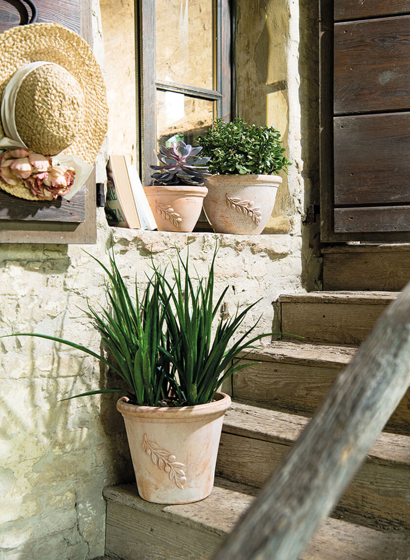 Grow some herbs in these terracotta pots and put them out if you have a wide ledge too. Take advantage of the sun in your kitchen window and grow some herbs. The olive branch on this pottery will fit right into a traditional kitchen. Have rosemary, thyme, or sage growing in your window in the Cassetta Olive, a matching flower box from Deroma's Olive pottery line. It's also a great container for centerpieces on long tables at a garden wedding, or alfresco dinner tables. These classic garden pots, adorned with a fruiting olive branch, are made from Terra di Galestro from the Tuscan hills, a raw material obtained from a gray rock that then takes on its characteristic red color when burned. The old clay composition is a mixture of clayey minerals that enrich the basic properties of this earth, including pyrite, which gives the planters an irregular effect and makes each pot one-of-a-kind. The Olive Bell Pot is available in a 7-inch and 11-inch size; they're shown together, sitting side by side, on the window ledge in our image.