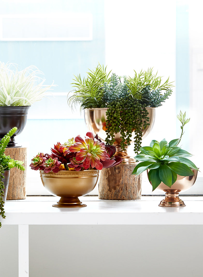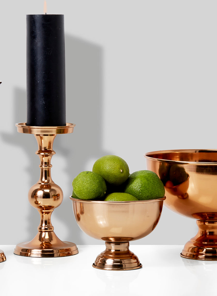 Consider pairing the copper flower compote with the arrow stripe mercury glass bowl or gold pillar holders to create an eclectic centerpiece of varying heights and shapes.