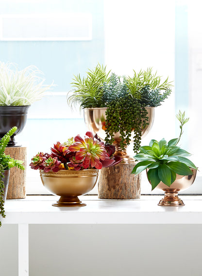 The copper finish also works with darker tones of green. For a nature-themed event, you can add our mixed succulent bouquet or green echeveria succulent to the flower compote. You can mix and match flowers, greenery and even fruits to put on display depending on the colors and theme of your event.
