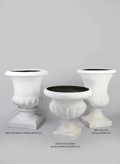 The magnificent urn known as the 19.5-inch Tall Cordoba Antique White Sand Rock Urn gracefully combines modern elegance with traditional European appeal. It can be wonderfully dressed with foliage, winter branches, or spring blossoms for year-round adaptability.