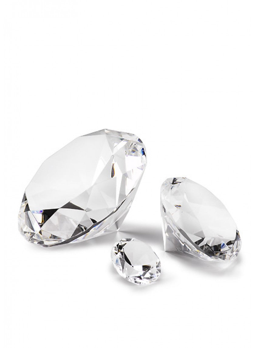 These round-cut clear decorative diamonds are available in two sizes. The larger 80mm size is ideal to use as a paperweight or display piece on its own, while the smaller 40mm diamonds work well displayed in groupings. Attach the smaller diamonds onto decor where extra sparkle is required or as table scatters with a few larger stones for variation.