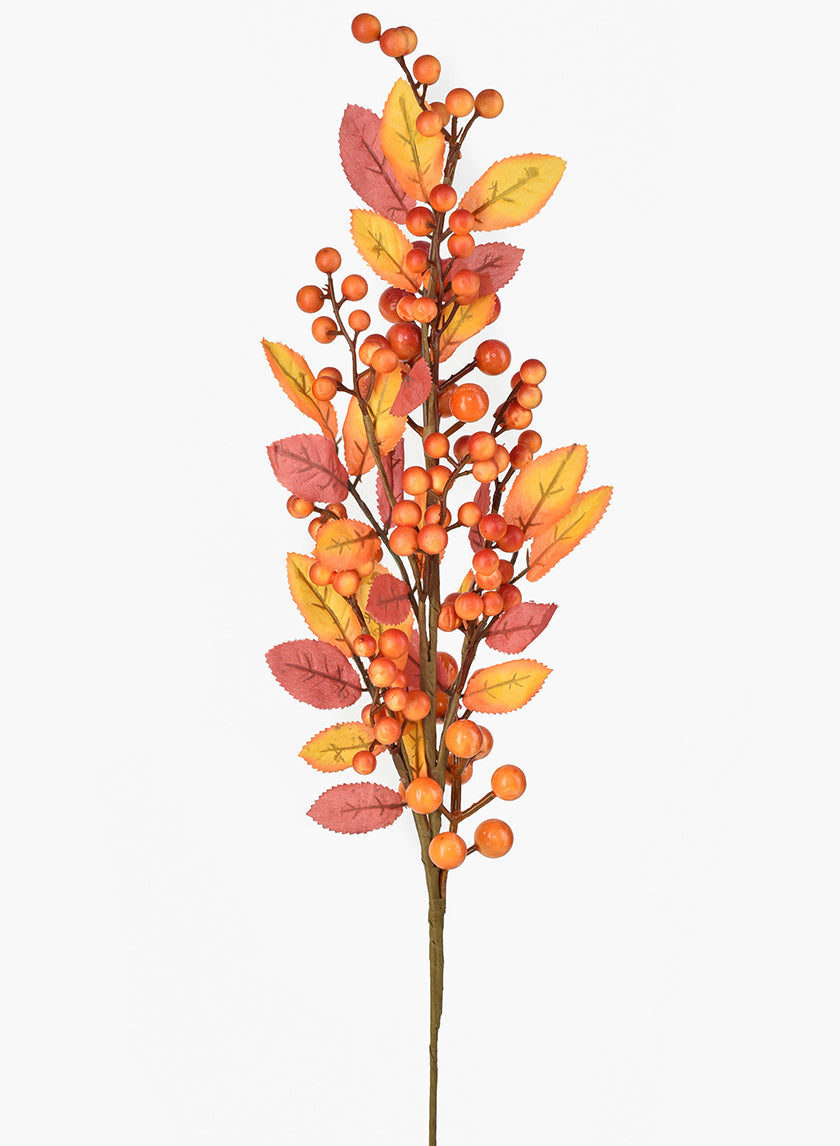 Bring the outdoors in with this artificial fall berry and leaf pick. This pick will work wonders during the fall; place a few of them in a vase and use it as a centerpiece for the office, table, or a store window. Orange and red leaves with coordinating berries that is attached to a brown stem will make you feel like you're in the middle of the park on a cool fall day. Measures 28-inches high and will make an excellent addition to your fall decor.