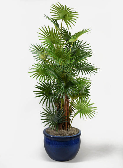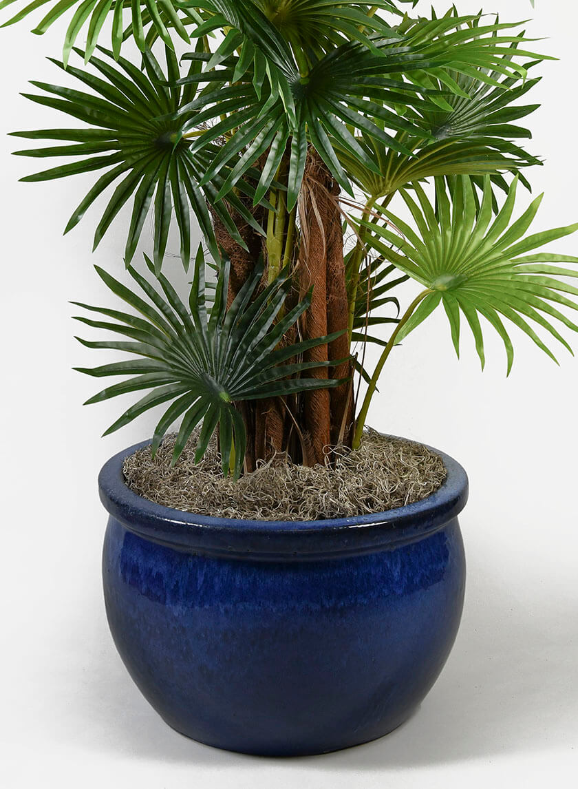 You'll love the look and falling blue color of these glazed ceramic Bavarian pots. Light and dark blue hues cascade down from the the square rim on each round planter, creating a the rich finish you see. Our pot is shown with an artificial fan palm tree, the top of the pot finished with some preserved Spanish moss. For your live plants you'll need a saucer for any runoff after you've watered your plants. These are the matching blue saucers for these pots.