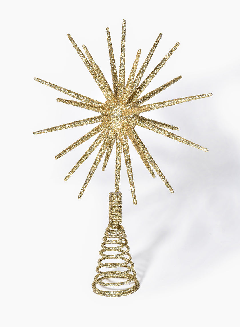 This gold glitter starburst tree topper will be a classic attached to your Christmas tree. The starburst tree topper measures 11 inches long so it is ideal for larger Christmas trees. Starburst design  that rests on a metal coil that is completely covered in gold glitter. Perfect decor for the holidays.
