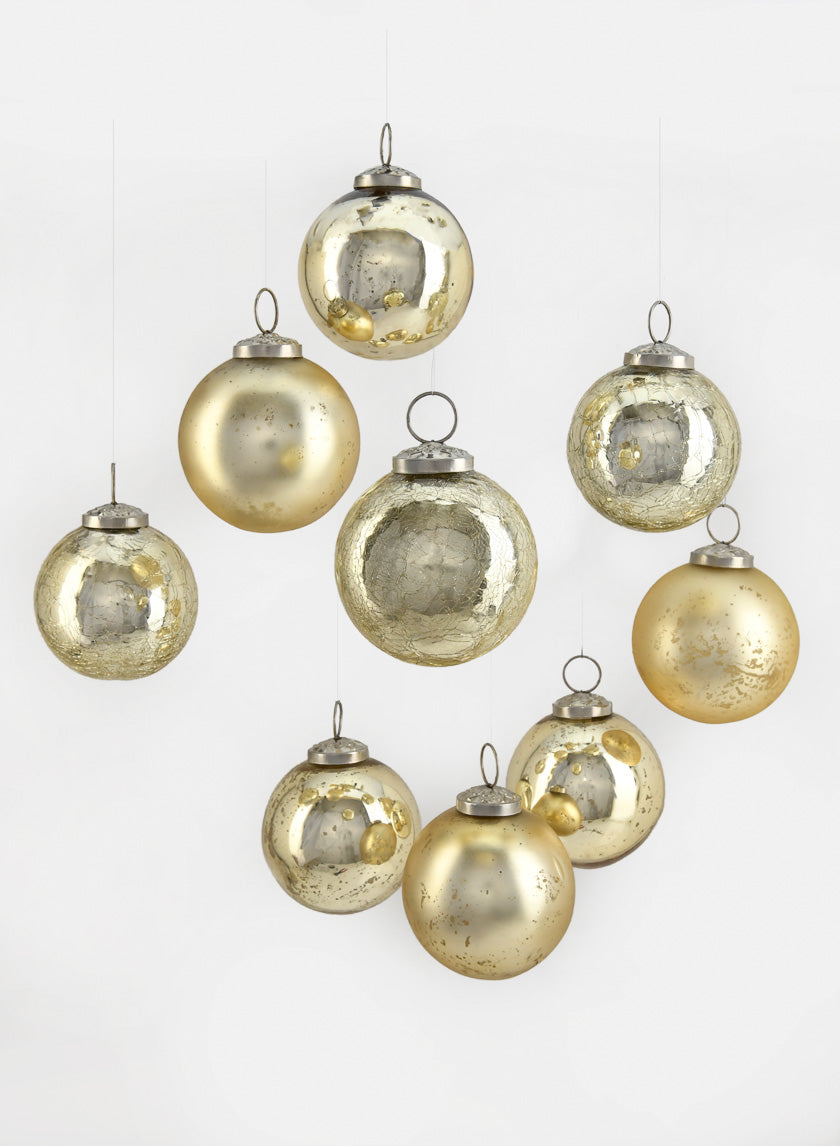 Our ornament ball set features a mercury design for a timeless, elegant style. The spheres come in a standard size of 3 inches, and the fixtures for connecting a string or ribbon contain intricate detailing for a gorgeous look. Silver and gold surfaces with reflective and matte designs will suit any decorative theme you want to create during the holidays.