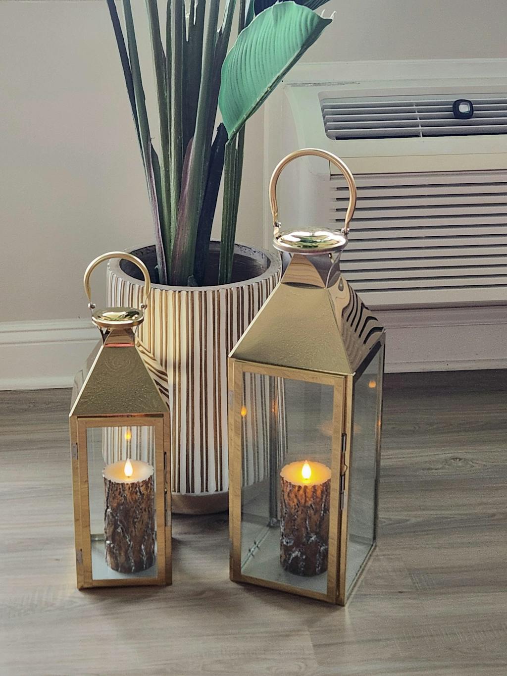 These Soho-style lanterns will turn heads on any occasion. They're perfect for weddings and events with black or white-and-gold color schemes. Pairing gold lanterns with black pillar candles or white square candles adds depth and symmetry. The white candles blend with the lantern's shape and add a soft, warm glow, while the black elongated candles add contrast for an eye-catching visual allure.