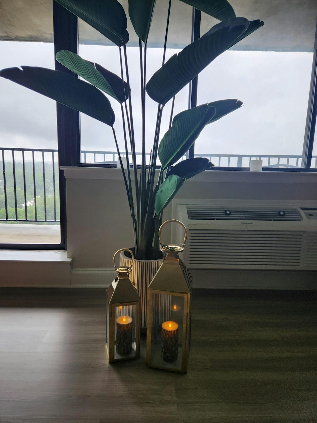 These lanterns can be placed strategically for maximum visual effect. They are available in three sizes — 13-inch, 21-inch, and 25-inch. Each lantern serves as a focal point at different sites. The 25-inch lantern works flawlessly as a table centerpiece, surrounded by faux white hydrangea sprays in a Bretagne matte gold steel capsule vase that promotes a gold indulgence. The realistic-looking white hydrangea flowers and white or black candles can break the varying gold textures and tones.
