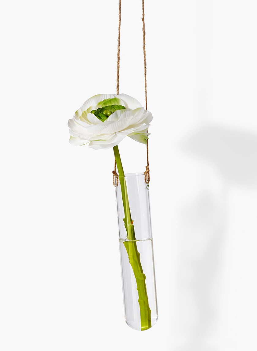 Create a pretty display of flowers for a wedding ceremony backdrop, with rows of these test tube vases hanging from a wall. Reuse this wall as a background for your sweetheart table or as a backdrop for a photo booth. Use the same idea for a store window display or a retail display; just use silk flowers. The vase comes with the attached jute rope shown. Our vase holds a white ranunculus.