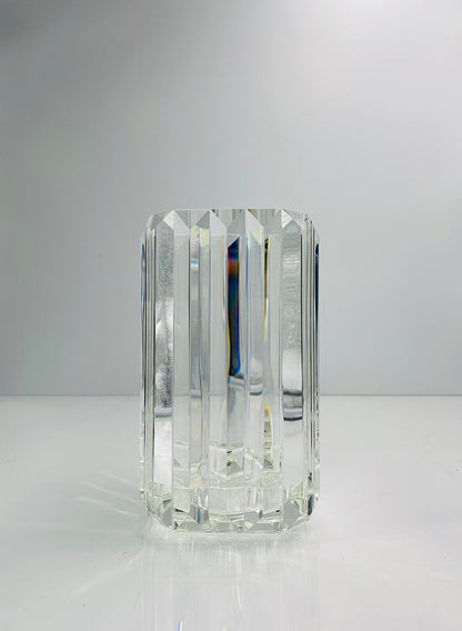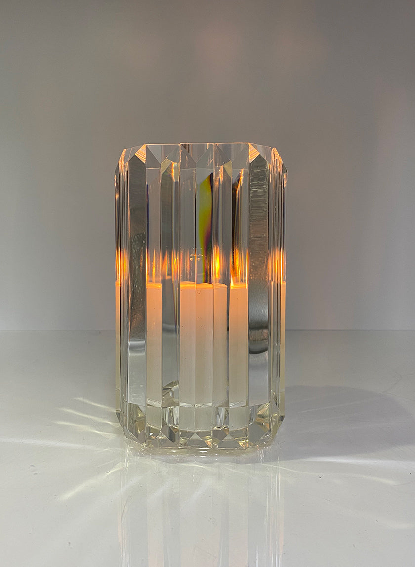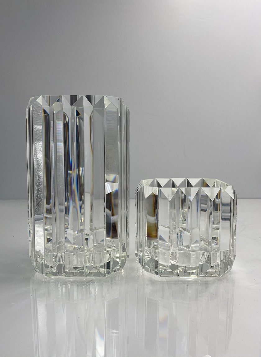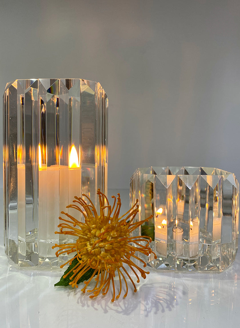 Crystal candleholders and other decorations are classic, sophisticated elements that add elegance to any event decor. Our 8 1/4-inch pyramid crystal candleholders offer an even more dazzling look. The pyramid-shaped facets allow the light of each flame to dance and shimmer. These candleholders are designed to hold large pillar candles like our 3x3-inch ivory square pillars or our white pillar candles.