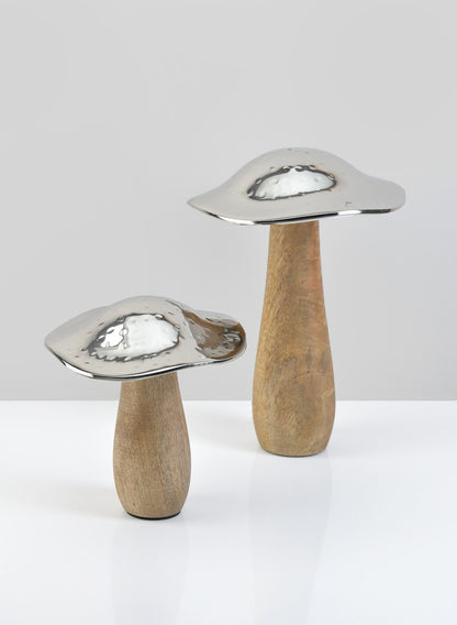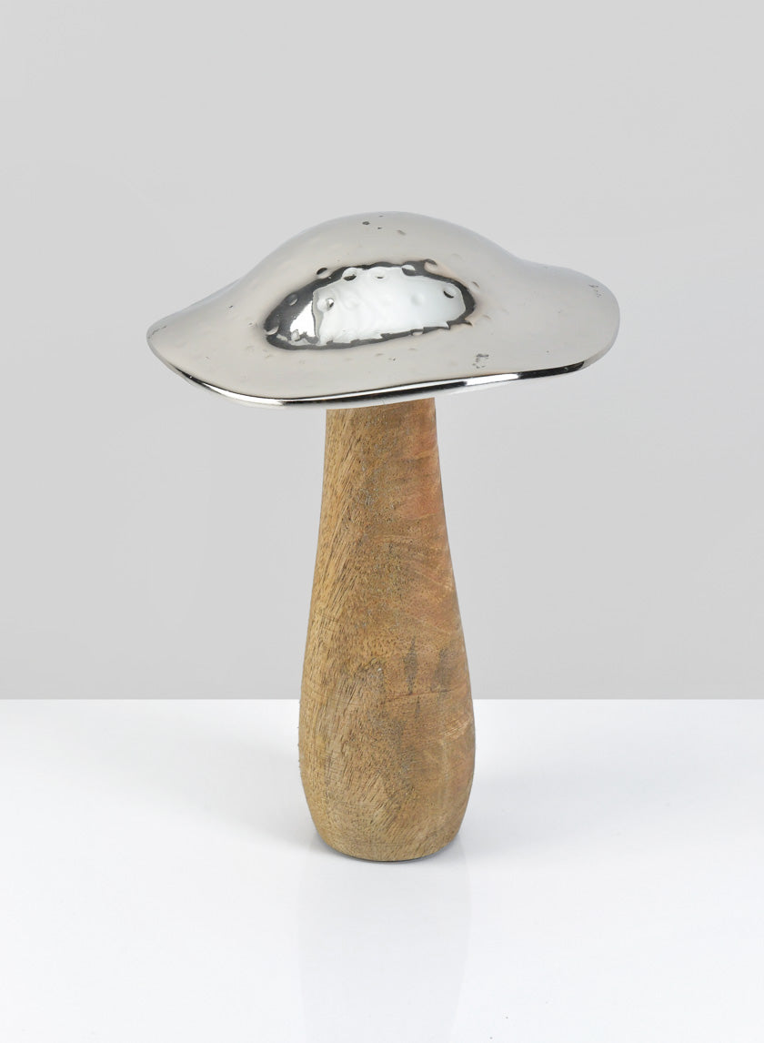 Bring a bit of nature and whimsy to your event with a large silver and wooden mushroom. This fun decor piece, which is 8 inches tall and 6 inches wide, features a solid wooden stem that adds a touch of earthiness to a decorative display. It also has a highly reflective and slightly textured silver mushroom top that will enchant onlookers.