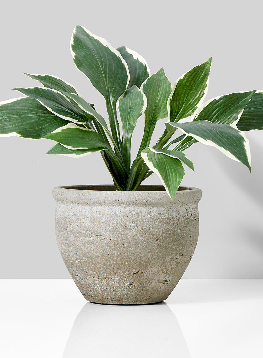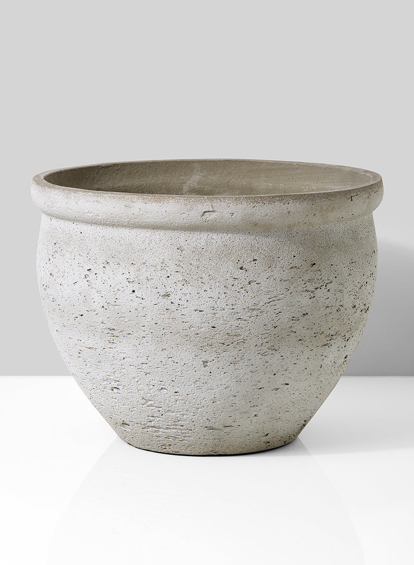 We love the natural cement finish, color, and texture of this fishbowl-shaped pot. This pot, made of Ro-cement, is a good size for a fa small tree, a fiddle leaf fig, or a palm.