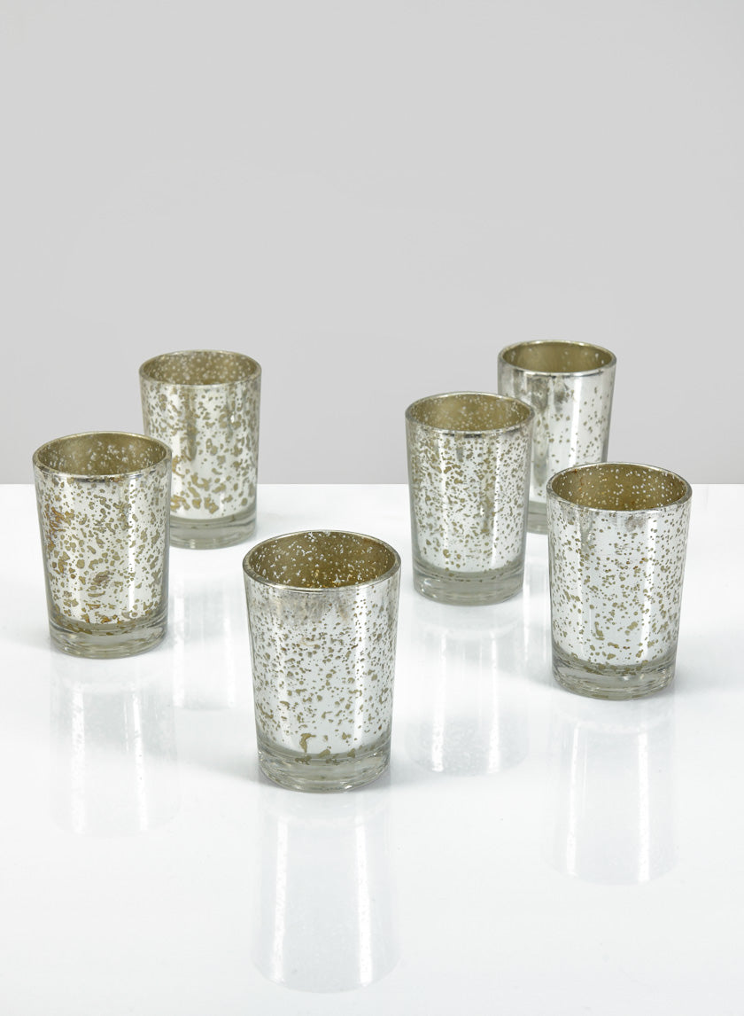 Add warmth and visual interest to your event with silver mercury votive holders. Made from mercury glass with a reflective silver finish, these candleholders have a charming worn, vintage look. At 2 1/4 inches in diameter and 3 1/4 inches in height, these holders easily house votive candles and tea lights.