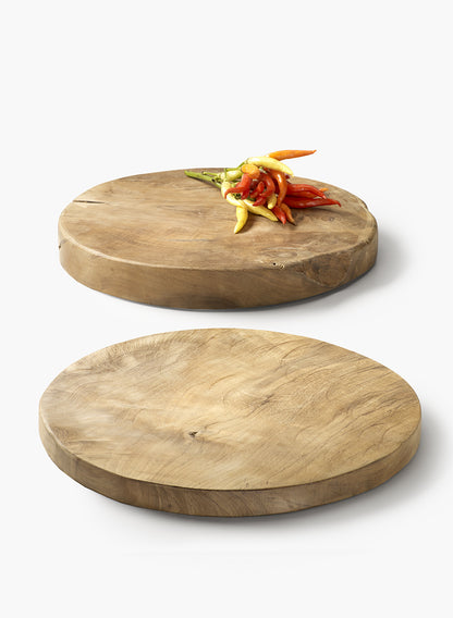Our round teak boards make great display trays. A centerpiece of bud vases and fruit would look great on these. The natural teak wood has beautiful color variations, crevices, and natural imperfections, making each piece unique.