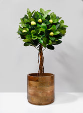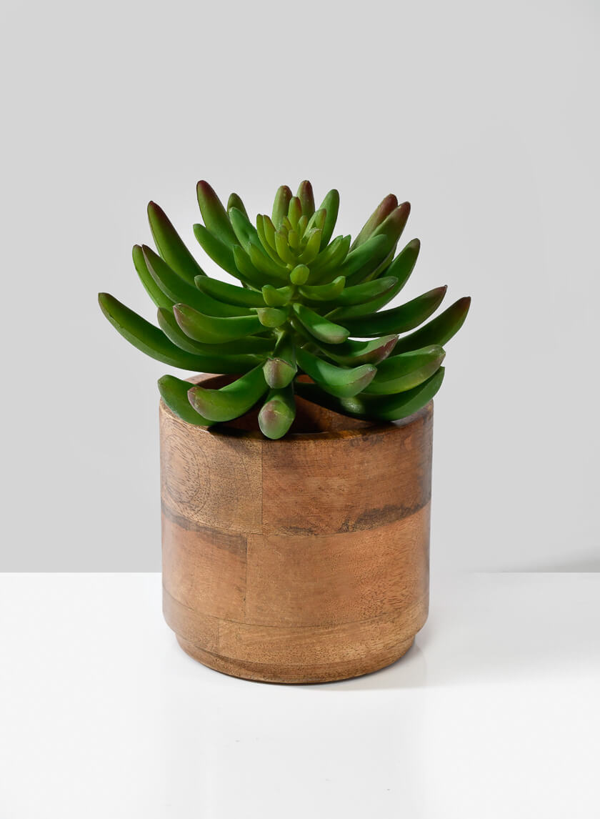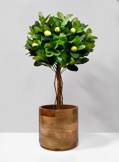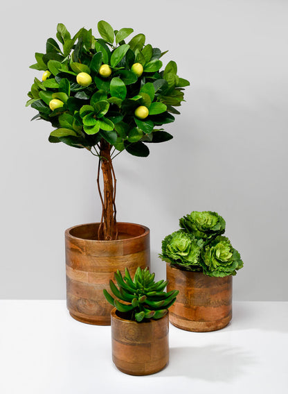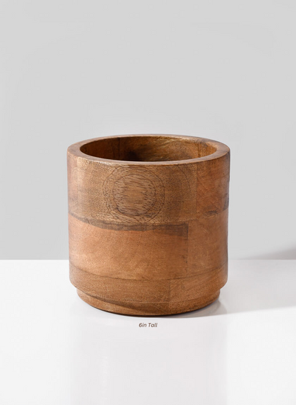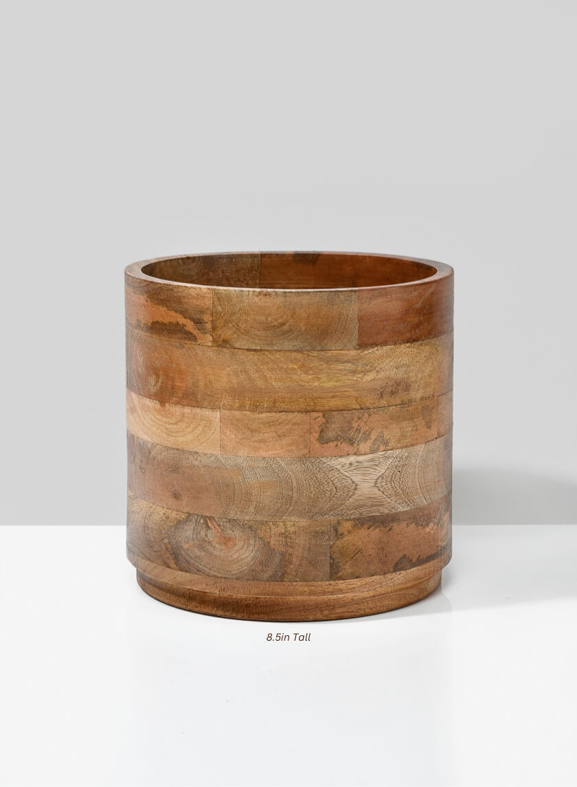 Made of solid mango wood with apparent patchwork grain, the Salma Wood Cachepot brings natural texture and deep warmth to any environment. Its cylindrical form provides a strong platform for sculptural branches, topiaries, or leafy greens.