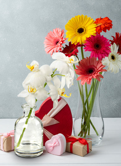 For a more casual look to your tablescape, or for a more informal affair, use a mix up different varieties and colors. This also gives a very realistic look to the whole group. Our collection of premade florals includes these lilies in glass bud vases available in 3 colors, that look great with this orchid.