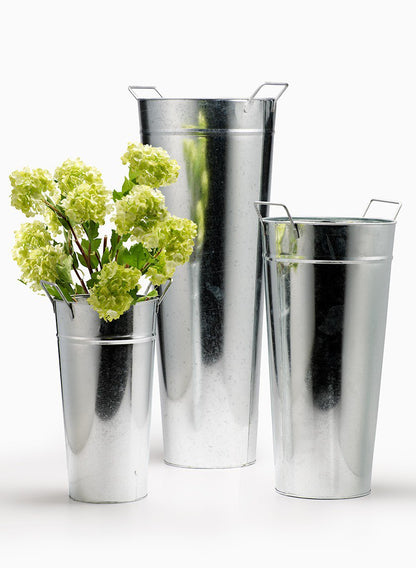 These galvanized zinc French vases have square handles. We love them filled with small branches and larger blooms like these faux Viburnum. These vases are sealed but are not guaranteed to be watertight. We recommend clear silicone applied to the seams to guarantee a proper seal.